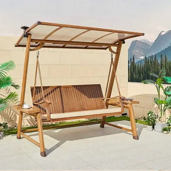 הנדנדה עשויה אלומיניום במראה עץ טבעי, ומשלבת תאורה סולארית נטענת מקרני השמש – שילוב של עיצוב אלגנטי ופונקציונליות חכמה.
