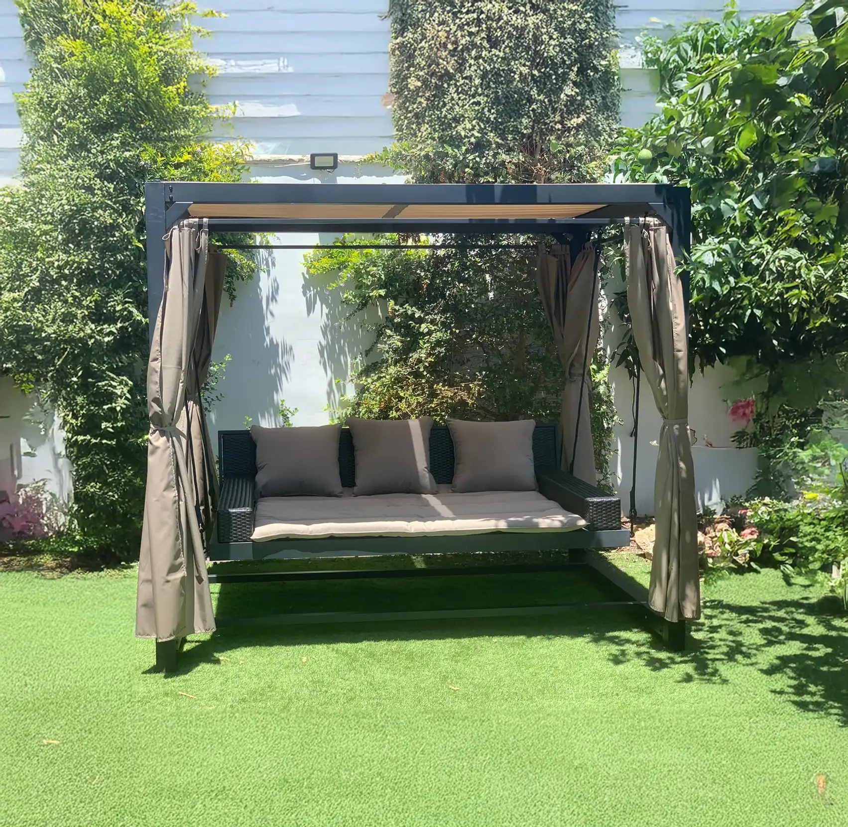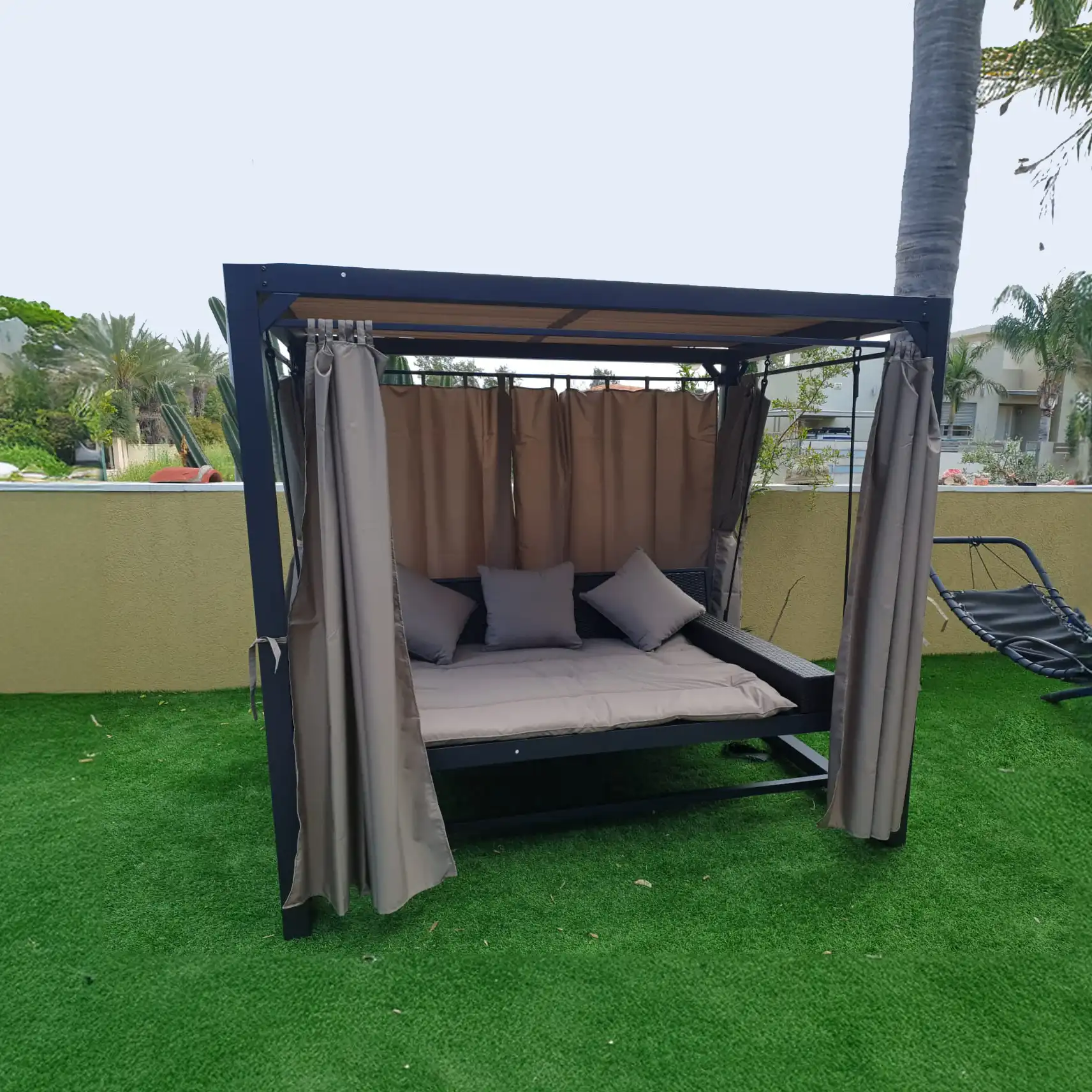 הנדנדה כוללת וילונות רכים שמעניקים פרטיות והצללה מושלמת, ומאפשרים לכם ליהנות מסיאסטה אמיתית בכל שעה ביום. שלדת המתכת החזקה, הצבועה בתנור בגוון אפור אלגנטי, מבטיחה עמידות גבוהה לצד מראה מודרני ונקי.