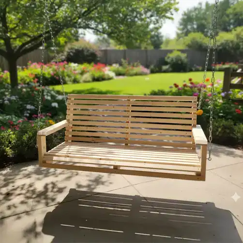 ספסל נדנדה לתלייה מעץ כולל שרשרת שאקלים ומזרן מושב מעוגל לנוחות מקסימלית באורך 140 ס"מ כולל שרשרת ארוכה ושאקלים לתלייה.